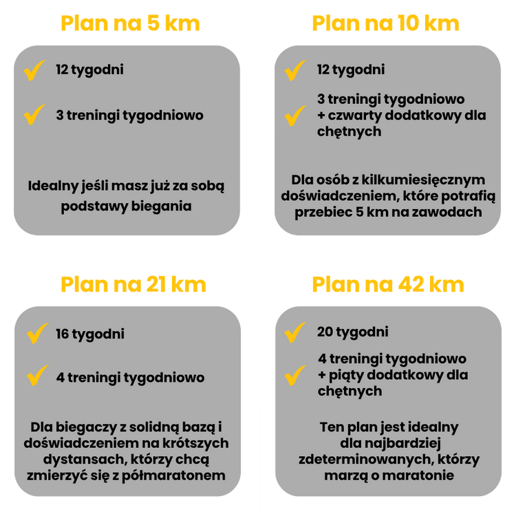 Przygotowałem sprawdzone i gotowe plany treningowe, które krok po kroku przeprowadzą Cię przez cały proces – od pierwszego treningu aż do linii mety.